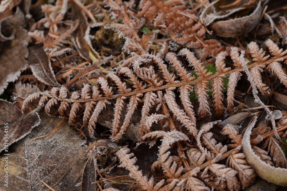 Hoarfrosted fern leaves orange and yellow, autumnal ferns for natural autumn background, autumn in forest, ferns pattern, ferns background.