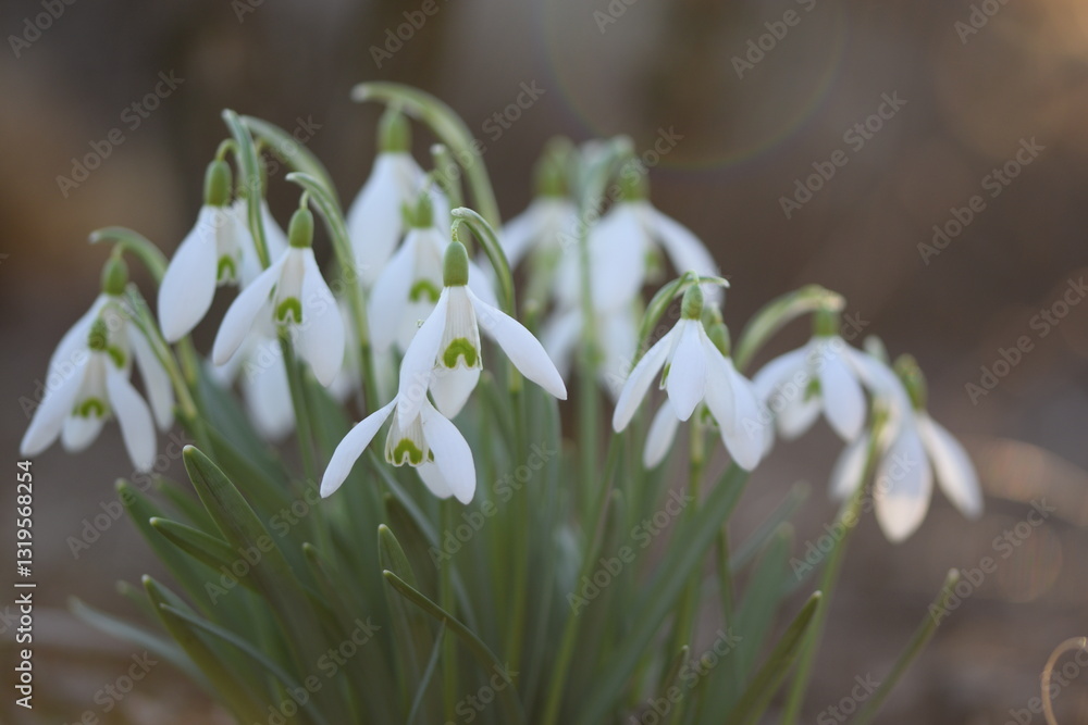 Snowdrops flowers on bokeh garden background with shiny bokeh lights. Snowdrops closeup horizontal. Early spring flowers.