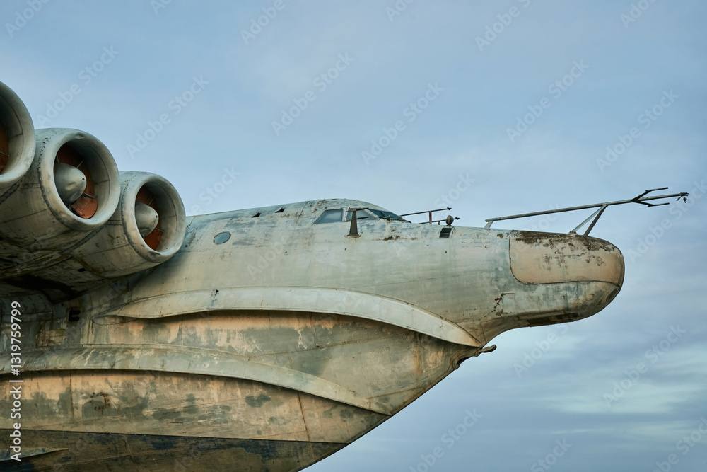 Detail of the abandoned Soviet Lun-class ekranoplan on the coast of the Caspian Sea. Dagestan. Russia