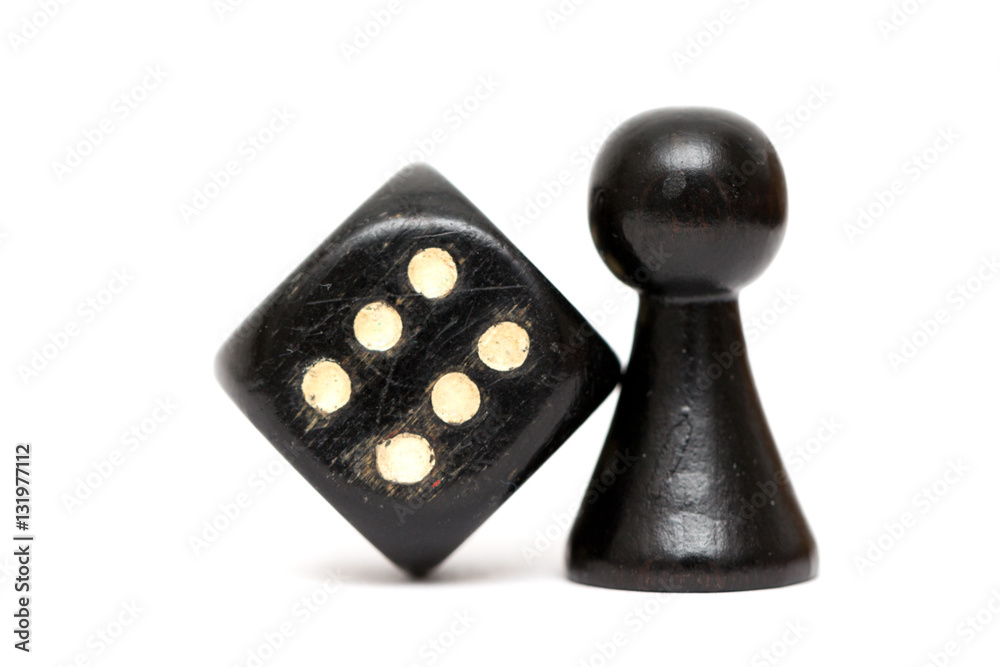 schwarze Spielfigur auf Holz mit schwarzem Würfel mit 6 Augen