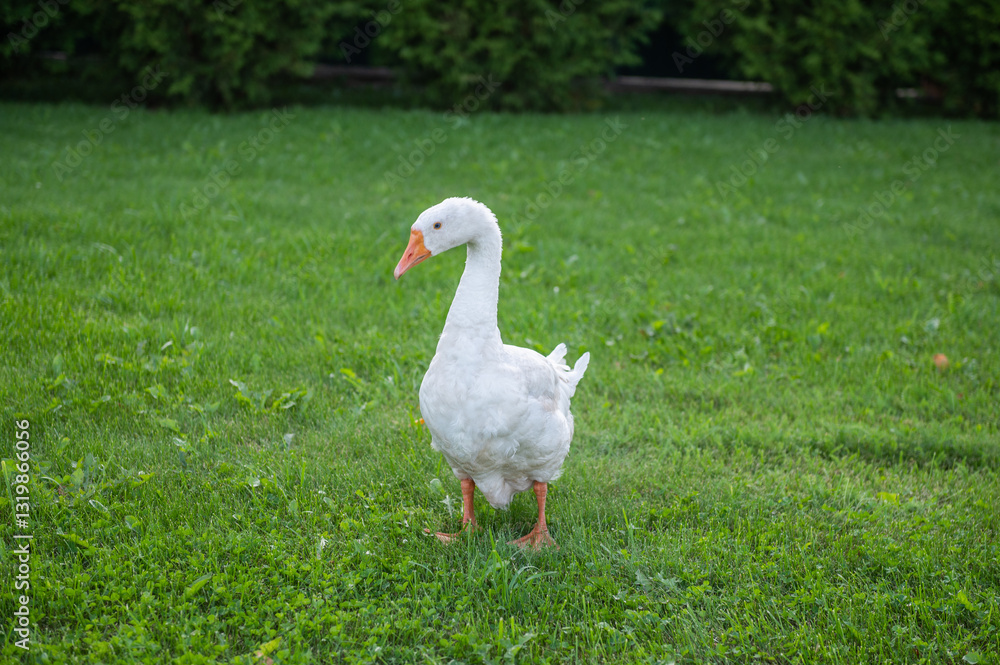 funny bird white goose walks in the summer on a green lawn in nature on a farm. High quality photo