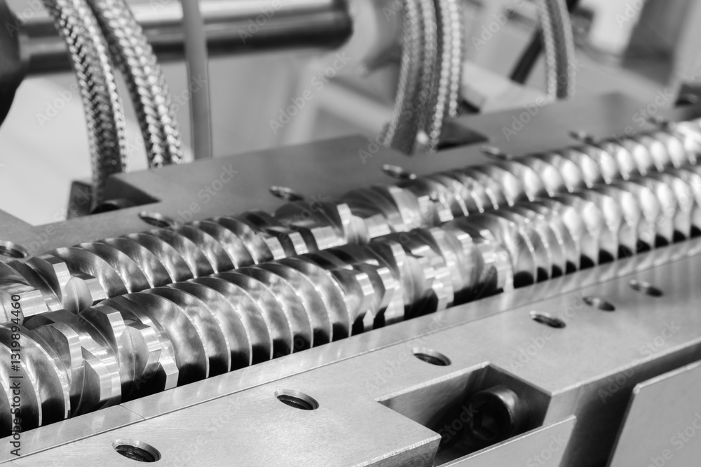 Spiral screw shaft for feeding granules into production machine for manufacture products from pvc plastic extrusion technology industrial concept background