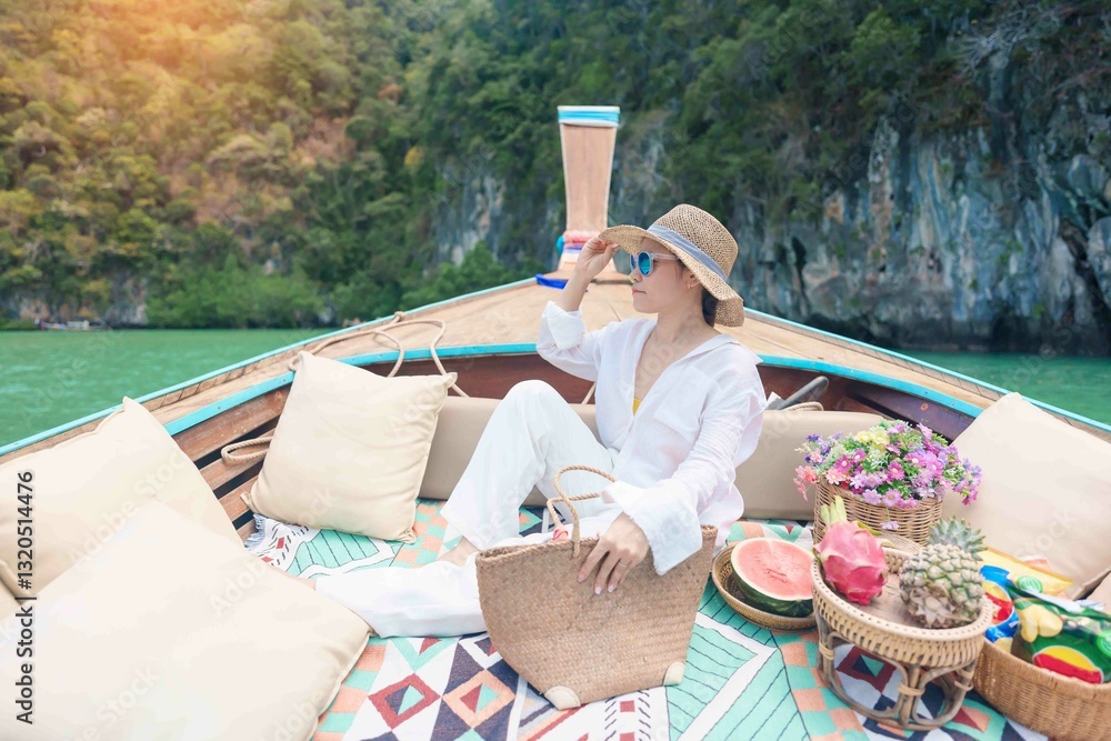 Happy Woman tourist in private longtail boat trip to koh Hong lagoon island at Krabi, Thailand. landmark, tropical destination, southeast Asia Travel, summer vacation, wanderlust and holiday concept