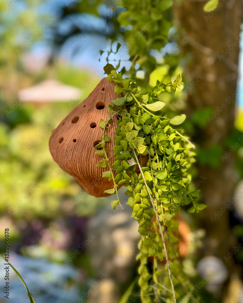 Hanging Clay Pot with Cascading Greenery – Natural Background 2