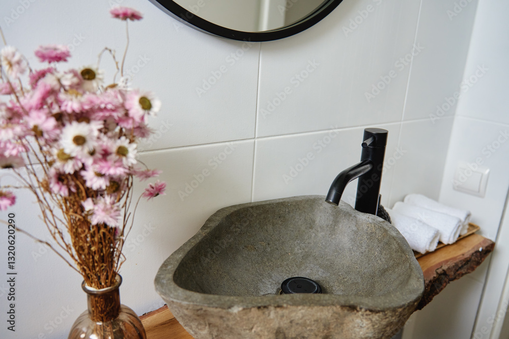 Modern Bathroom interior with stone basin, black faucet, white towels and rustic wooden countertop. Stylish bathroom with natural minimalist decor in modern apartment