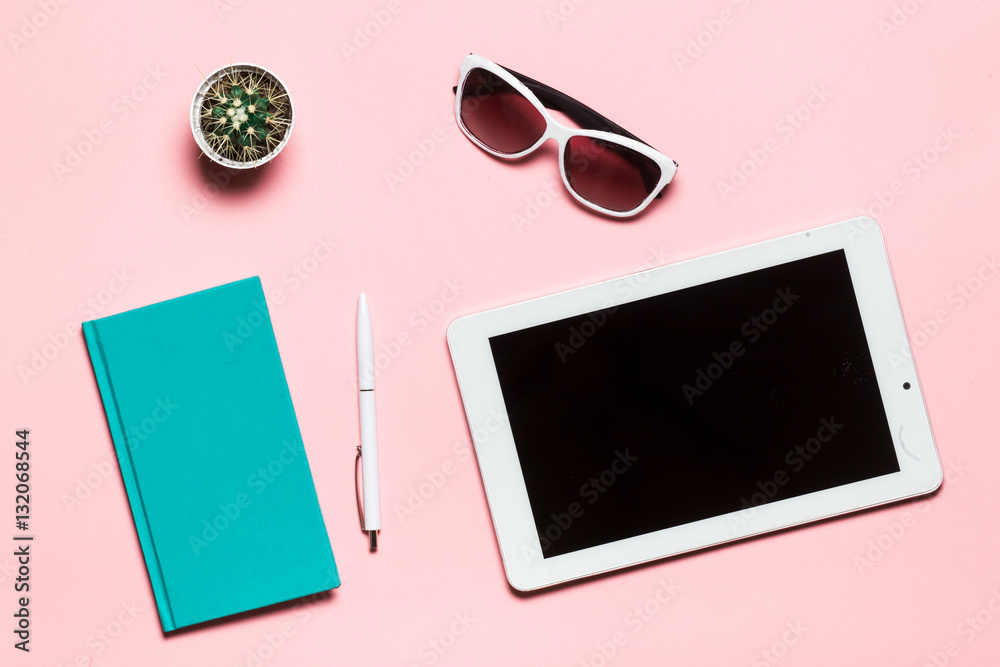 White tablet, pen, glasses, mint diary, and cactus on pink background. flat lay, top view.