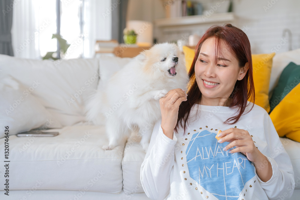 happiness joyful asian female woman stay home play embrace spending time with animal pet dog white pomeranien hug hold love smile while sit relax on wooden floor home leisure sofa living room