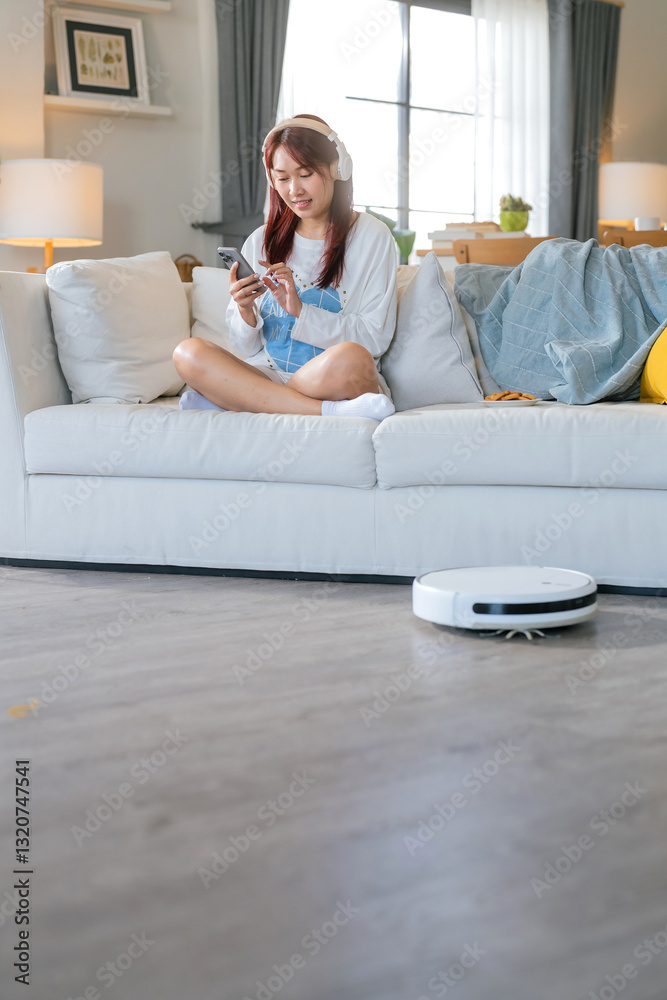 Young Asian woman relaxing sit on sofa home and turning on her smart vacuum cleaner using smartphone control robot while listening music headphone smart life smart technology lifestyle home hygiene