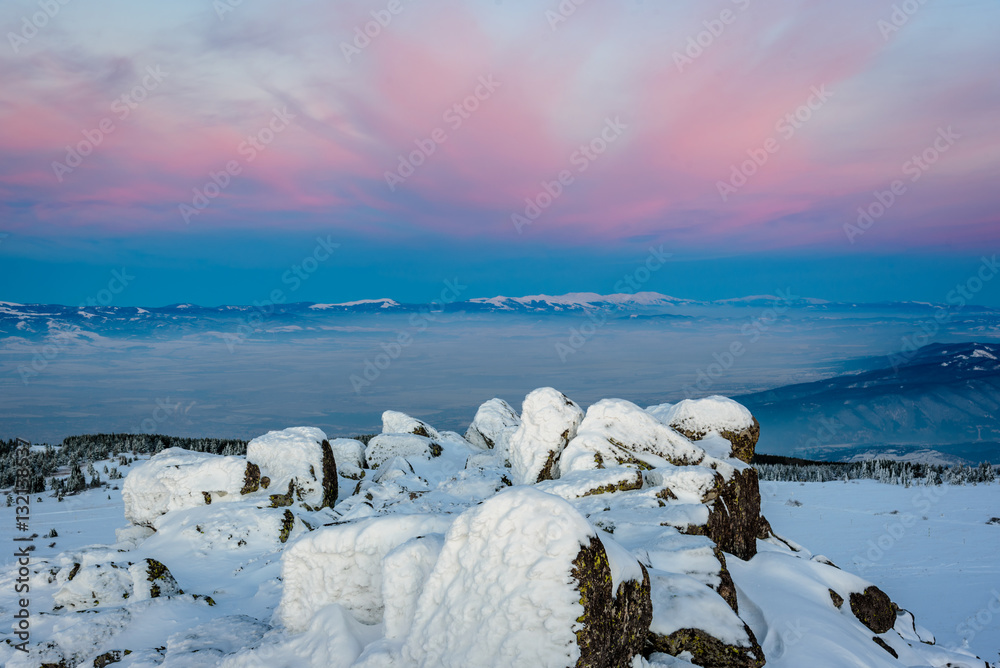 Amazing winter sunset - beautiful frozen landscape, jagged rocks and orange skies - pink clouds over a distant mountain range