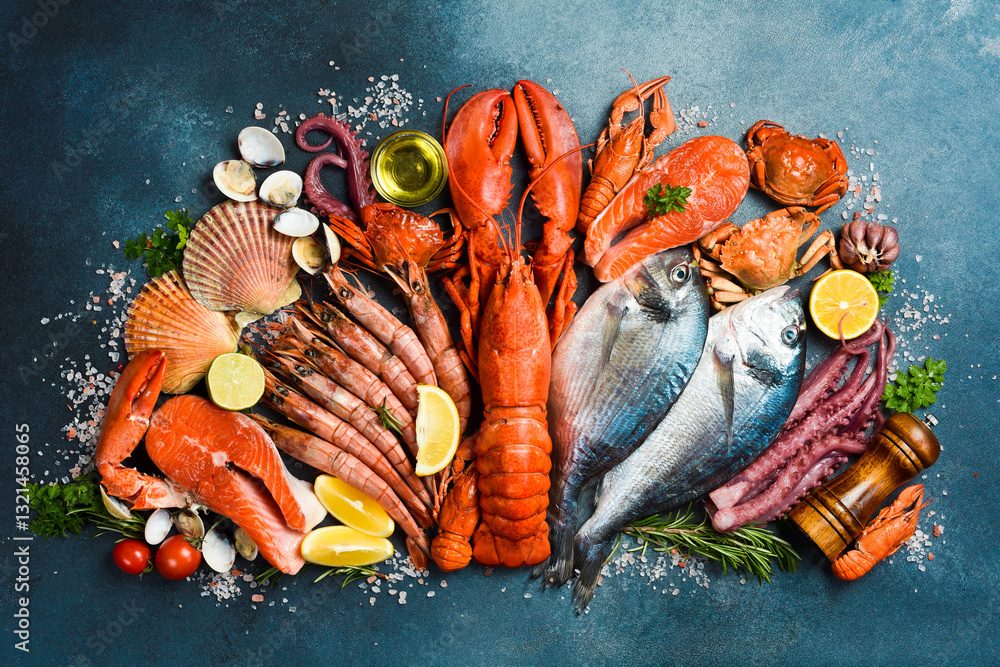 Fresh seafood. Wide food banner. Fish, octopus, lobster and other seafood on a gray stone table.