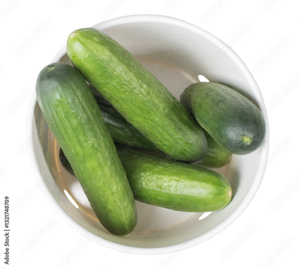 Several freshly picked cucumbers lying in white cardboard packaging, top view of fresh garden vegetables ready for culinary use isolated on transparent background,