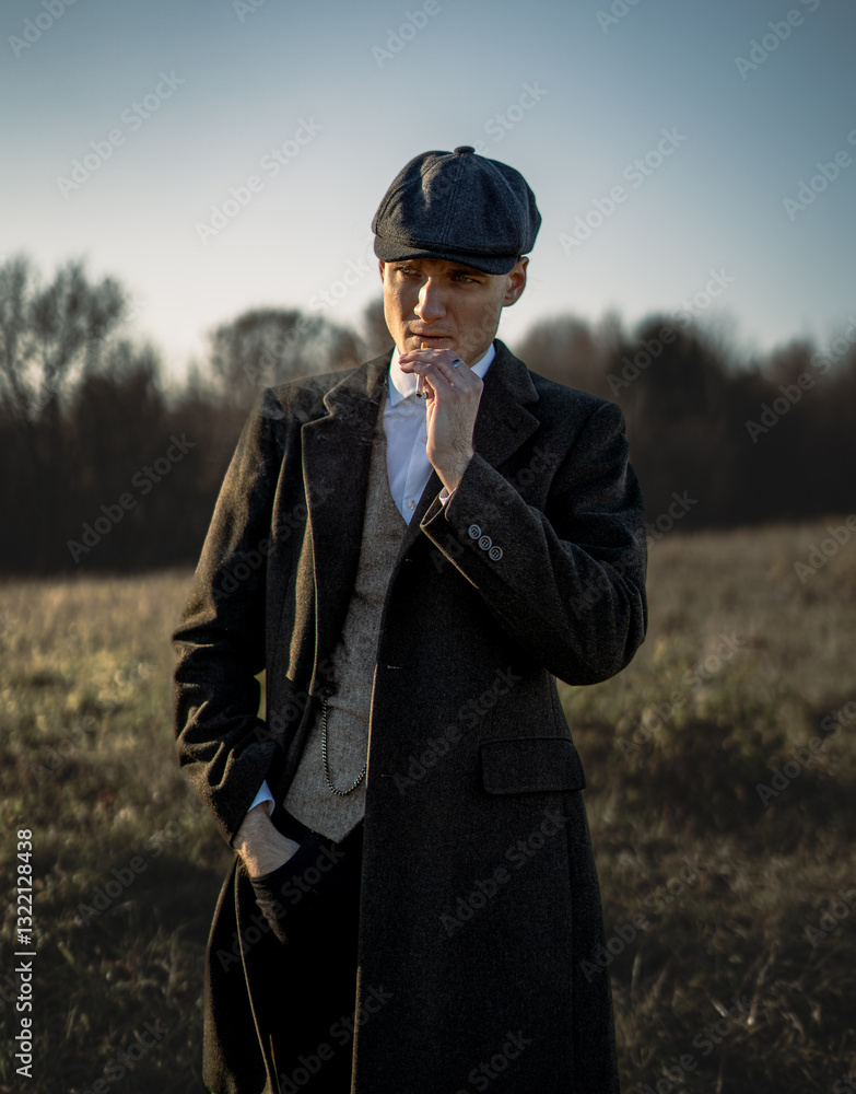 A stylish man in 1920s-inspired fashion, wearing a wool coat, vest, and flat cap, smokes a cigarette in an open field. The soft sunlight and blurred trees create a nostalgic, cinematic atmosphere.