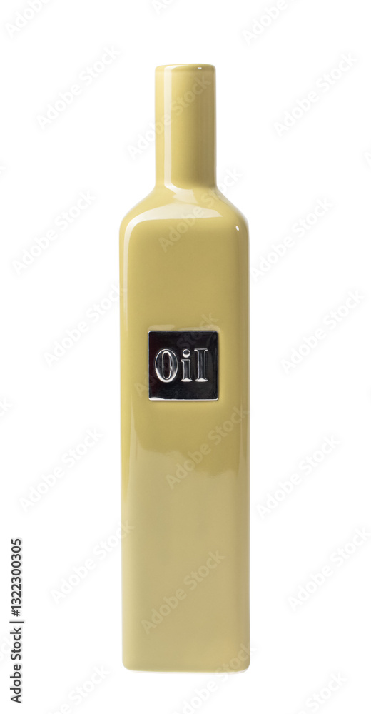Studio shot of yellow ceramic oil bottle with silver label label saying - oil, isolated on transparent background, storage space and cooking essentials,