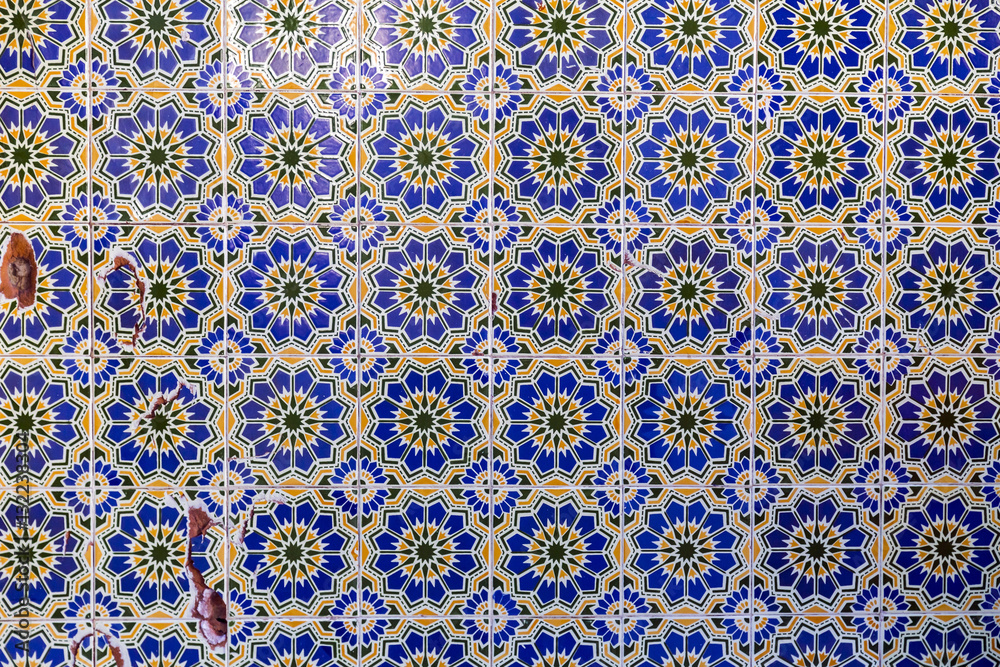 Tunisian tiles with traditional geometric shapes , ceramic tile covered wall texture background