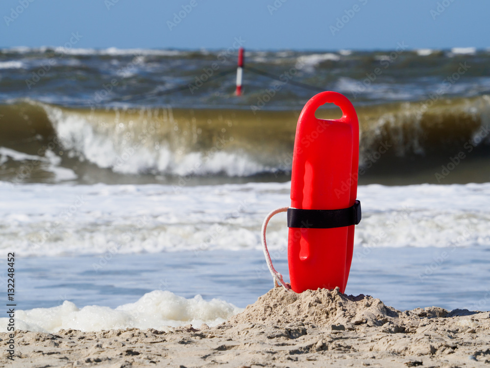 Red flotation device (buoy) for water rescue at the beach. Windy day at the north sea.