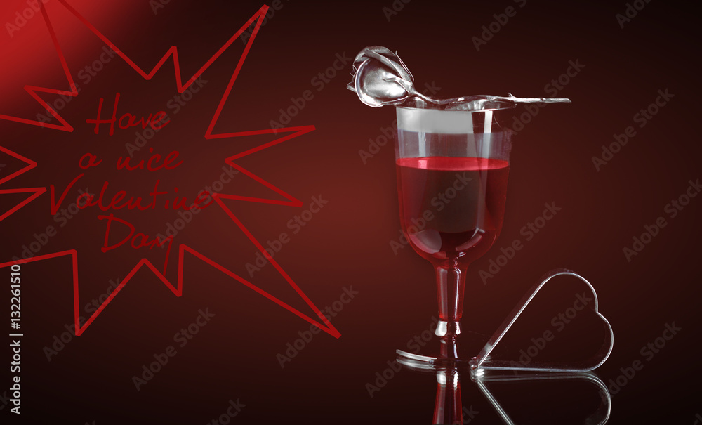 Composition with red wine in glasses, silver roses and heart. Va