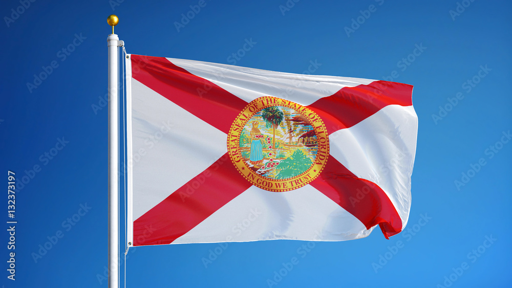 Florida (U.S. state) flag waving against clear blue sky, close up, isolated with clipping path mask alpha channel transparency, perfect for film, news, composition