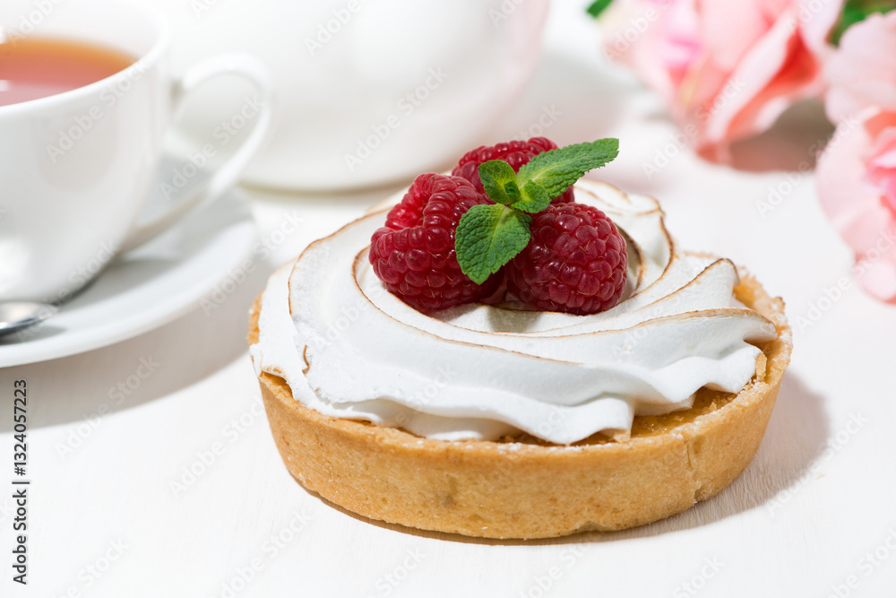 sweet dessert tartlet with meringue and fresh raspberry on white table