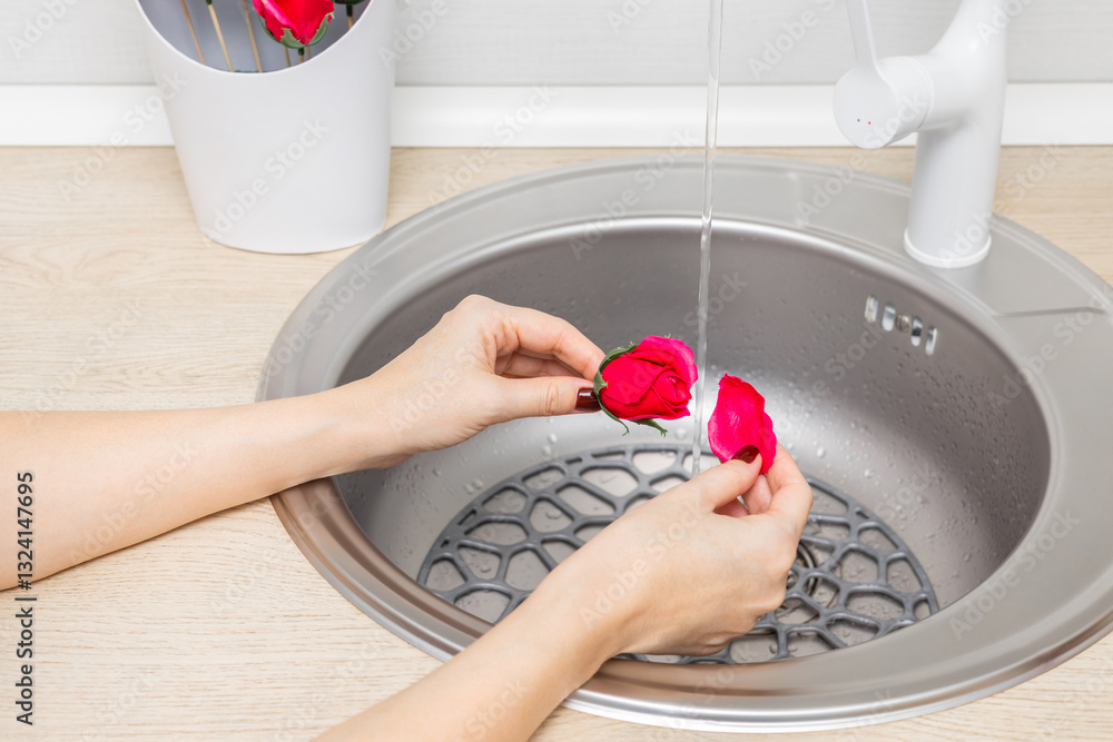 woman washing her hands with flower shaped soap. red rose shaped soap. soap rose petal