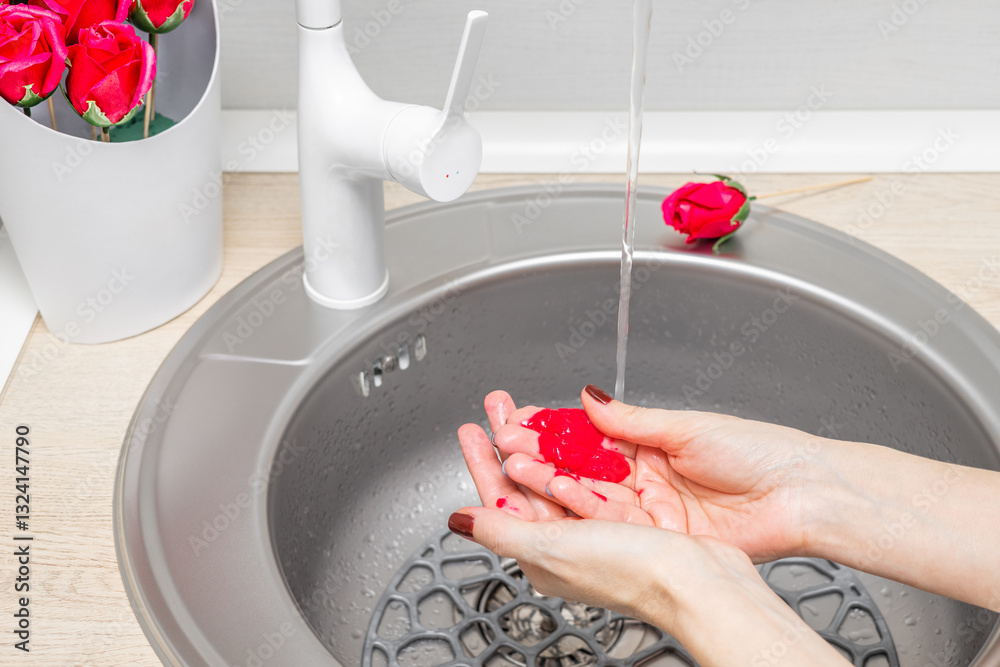 woman washes her hands with red soap. woman washes her hands in a sink. red rose shaped soap.