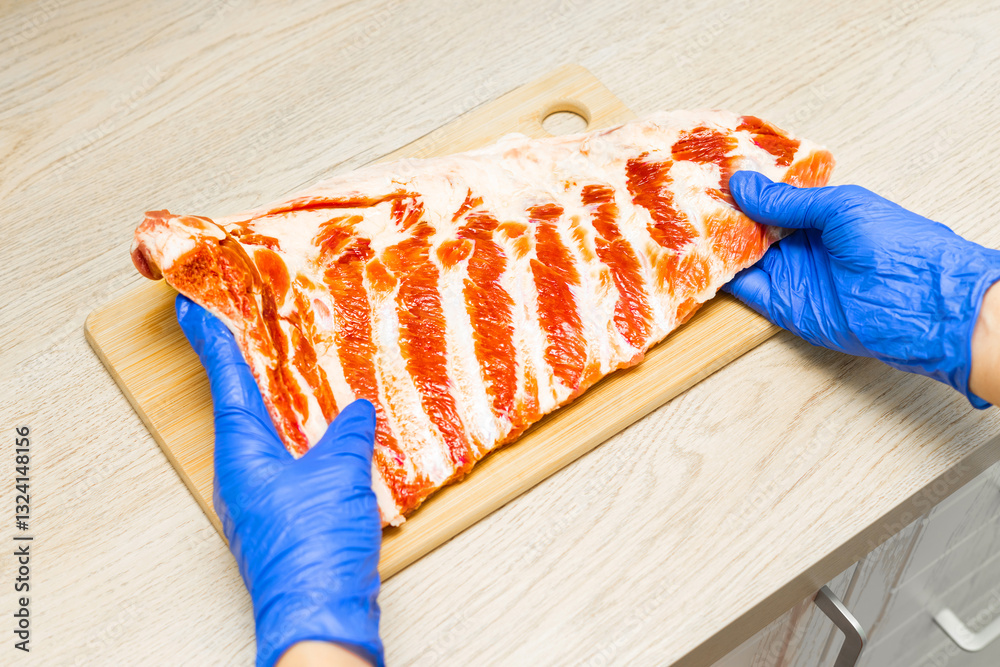 housewife cooking pork ribs in home kitchen. pork rib with layers of fat and red meat. preparing pork ribs for roasting. pork rib on a cutting board.