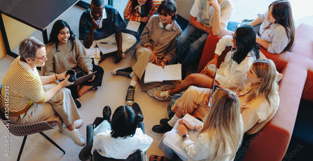 College students gathering on campus in collaborative group study session with a diverse mix of young adults