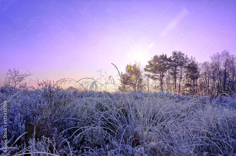 Silhouette of a tree amidst a scenic winter landscape with frozen moorland