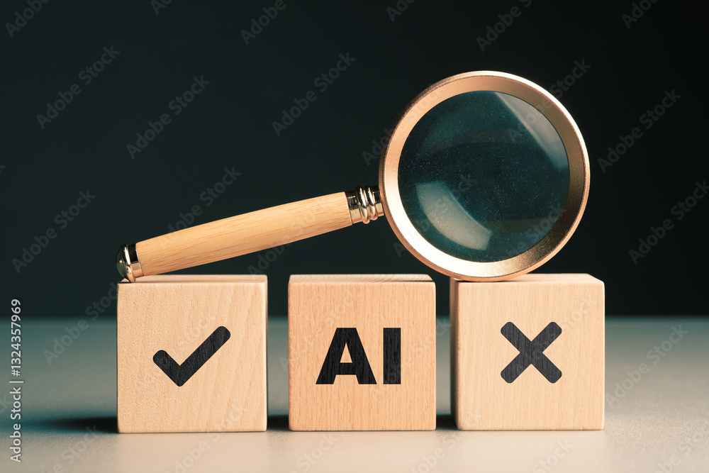 AI concept with a magnifying glass and right, wrong, symbols in the wooden cubes, accuracy information from AI, advantages and disadvantages, right way to use AI