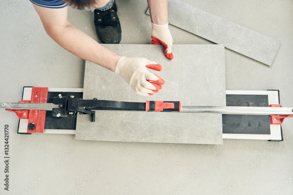 An installation for cutting large ceramic tiles into smaller tiles with precise dimensions. Close-up of the master cutting the tile into two parts with a machine. High quality photo