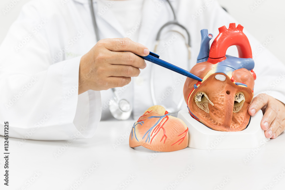 Doctor hand point patient heart model anatomy and explain before treatment for diagnosis heart attack.Concept for treating and prevention heart diseases.Medical heart care and treatment concept.