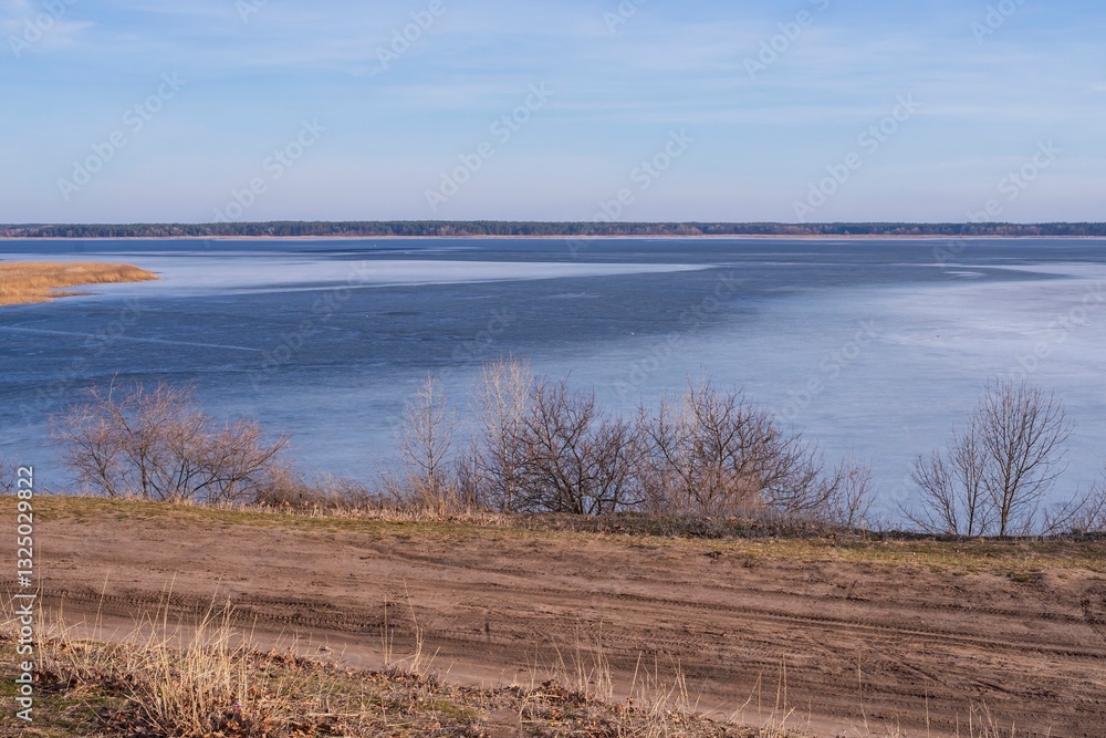 Beautiful landscape of a frozen river in early spring. First thawed patches. Sunny spring day