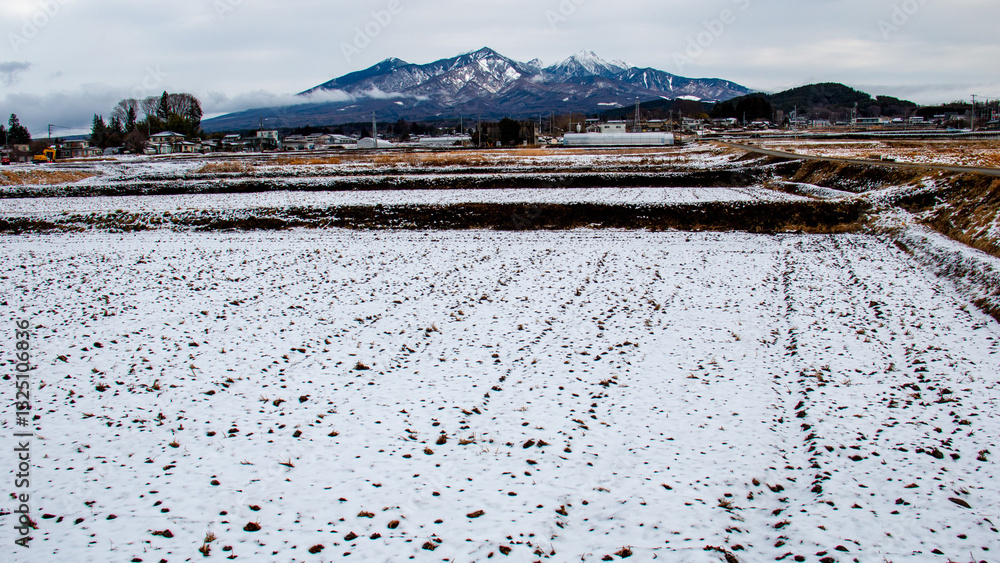 北杜市の冬の畑越しに厳冬期の八ヶ岳連峰を望む 山梨県北杜市 日本