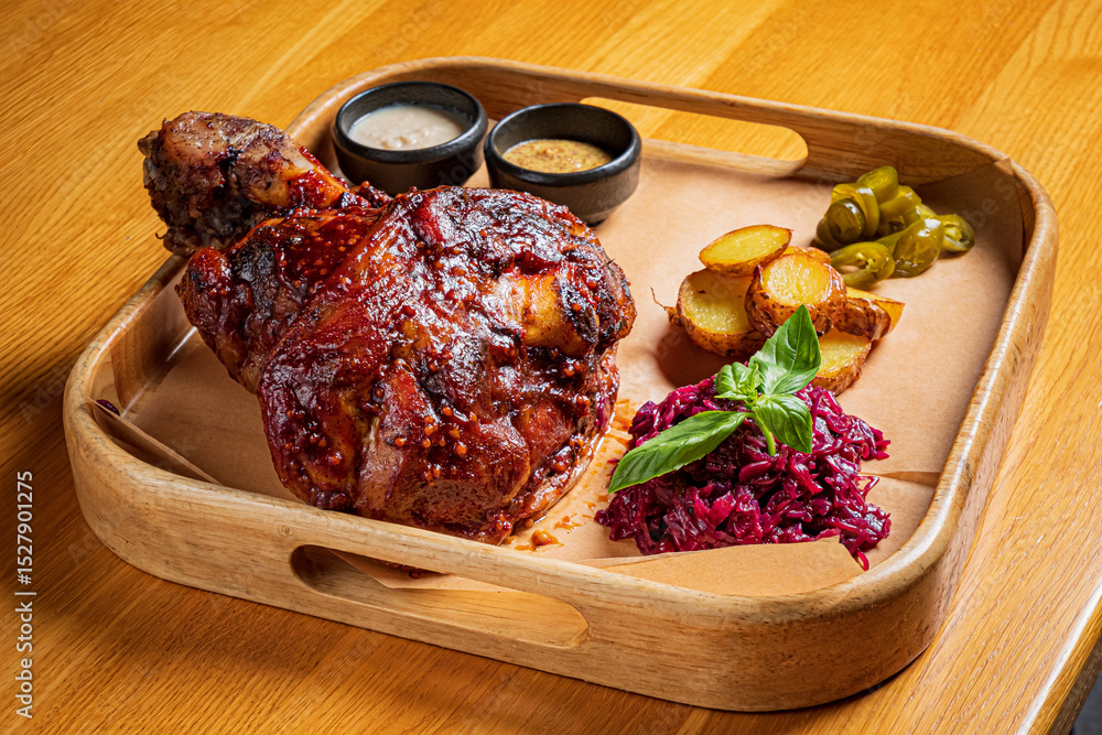 Young man with unhealthy food and soda on blue background. Overeating concept