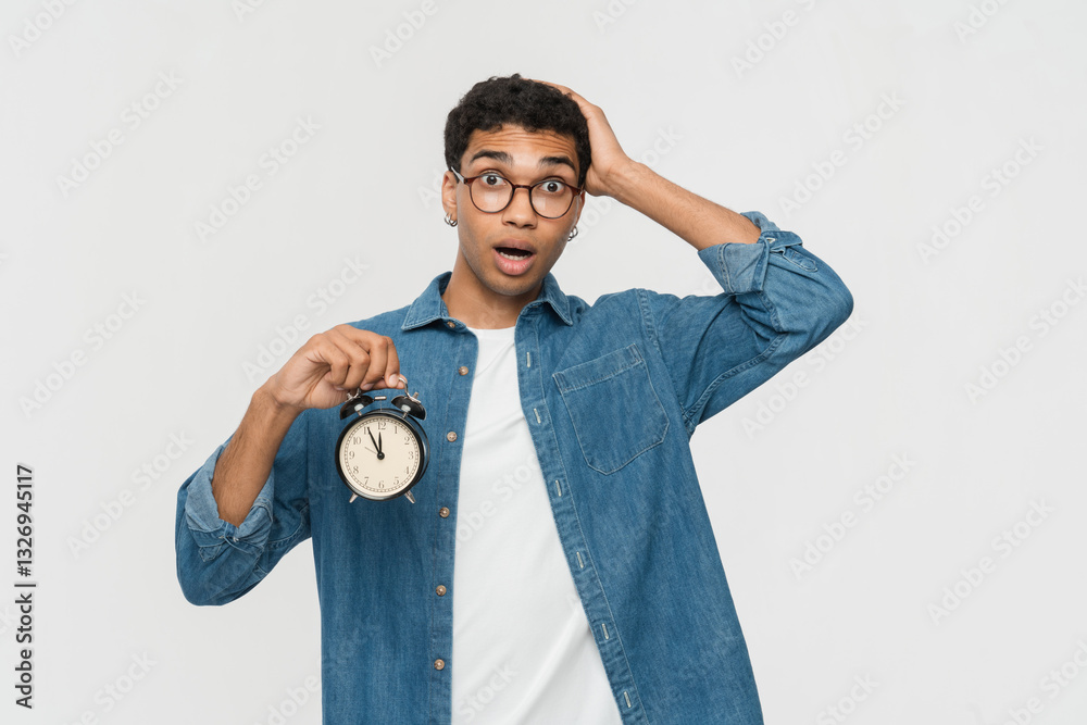 Photo of young African guy male student man amazed shocked hand touch head hold alarm clock late overtime wear casual outfit isolated over white color background