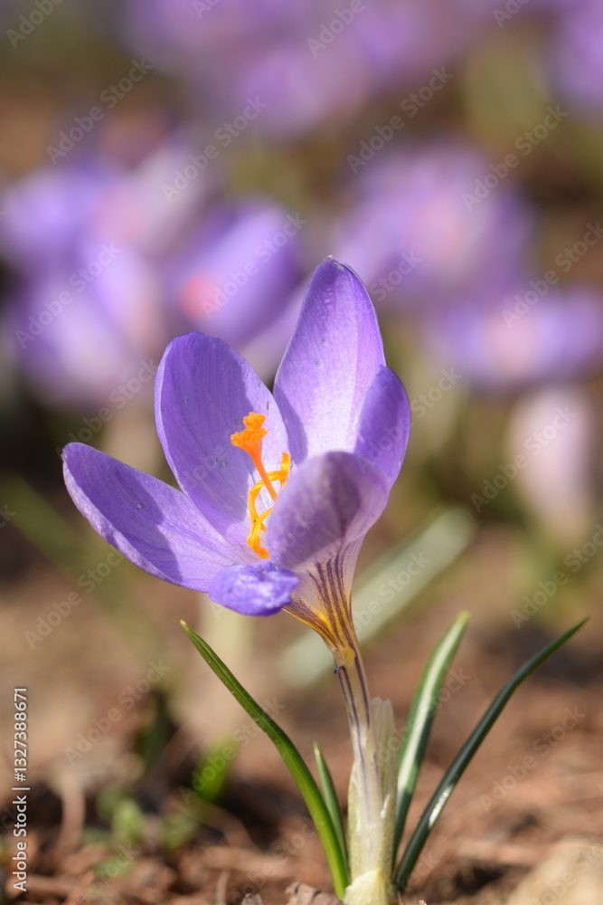 Blooming violet crocuses in spring garden. Flowers closeup on bokeh background, selective focus.
