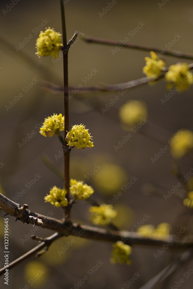 Blooming yellow cornus mas, cornel blossoms on shrub closeup, bokeh background, selective focus