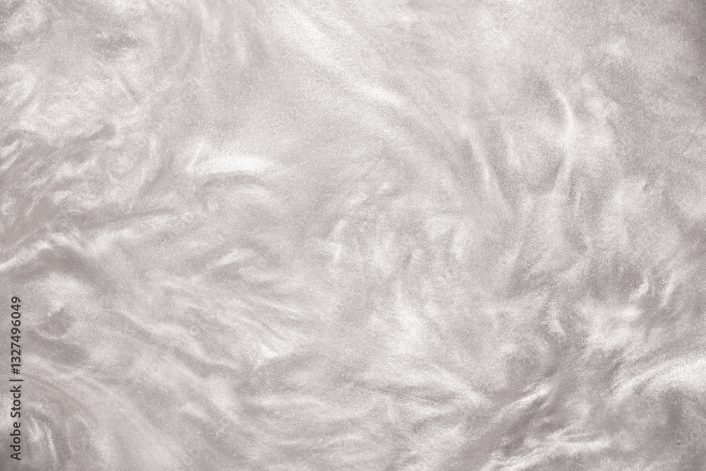 Shimmering silver abstract background. Liquid glitter paint texture waves and swirls. Beautiful shiny white glitter texture. Metallic silver paint close-up as a holiday background.