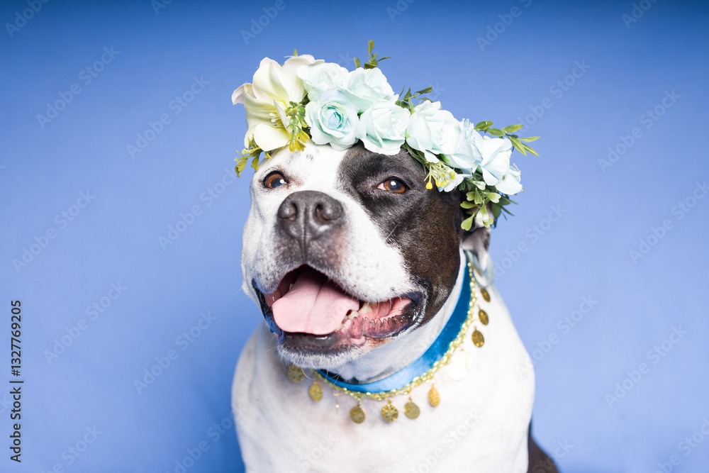 a dog wearing a flower wreath on a blue background with a bouquet of flowers. Fashionable pet, American Staffordshire Terrier