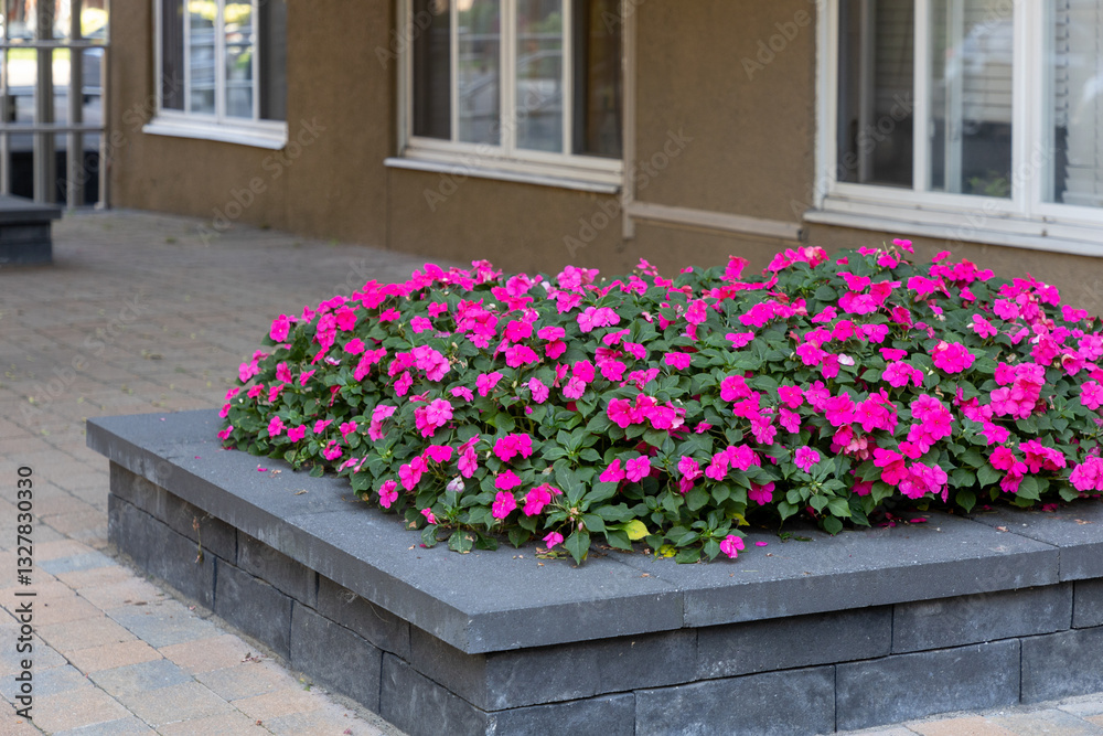 Flower bed with petunia on the sidewalk. Flowers near building. Street decor