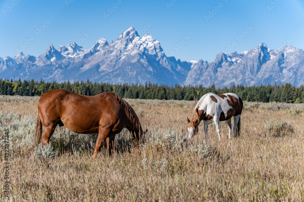 The horse (Equus ferus caballus) is a domesticated, one-toed, hoofed mammal. Elk Ranch Flats Turnout, Wyoming. Grand Teton National Park.