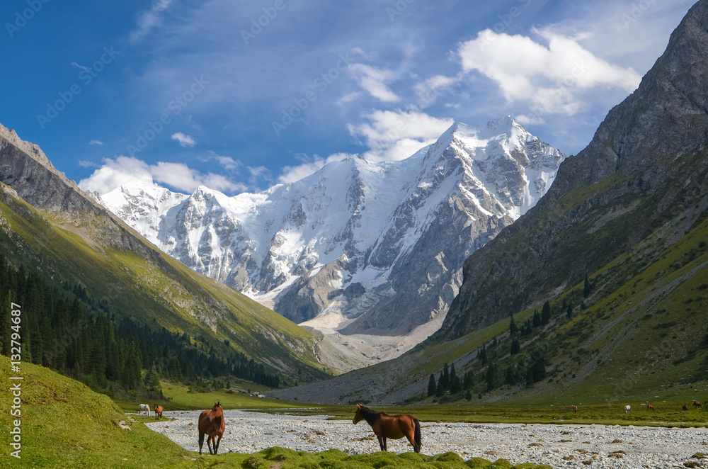 Wild horses on a sunny meadow in the mountains. Herd of horses grazing in picturesque mountains in Tian Shan mountain, Karakol, Kyrgyzstan, Jety-Oguz, Central Asia.