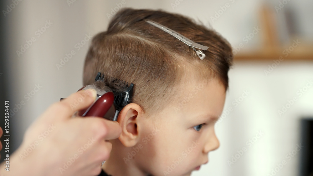 Young boy getting haircut at home. Cropped hands of young mother cutting hair with hair clippers. Time for a Haircut