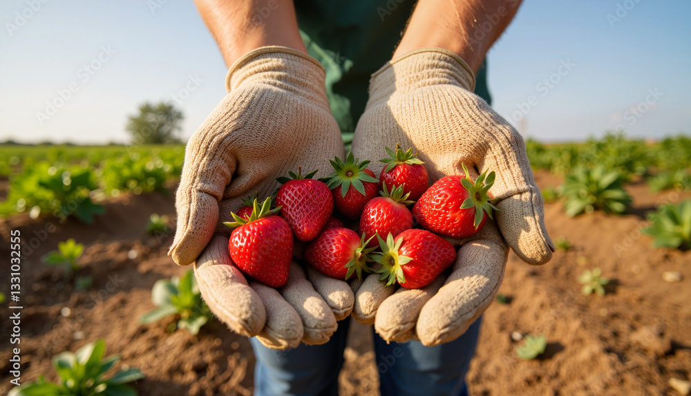 Hands holding fresh strawberries in a vibrant field, agricultural joy