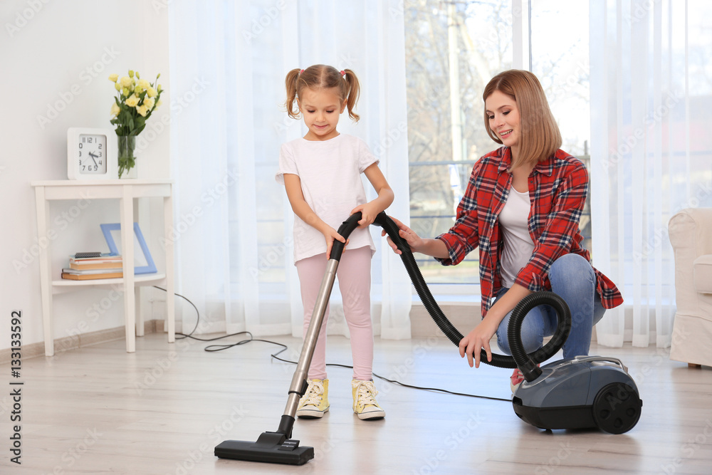 Pretty woman and her daughter hoovering floor at home
