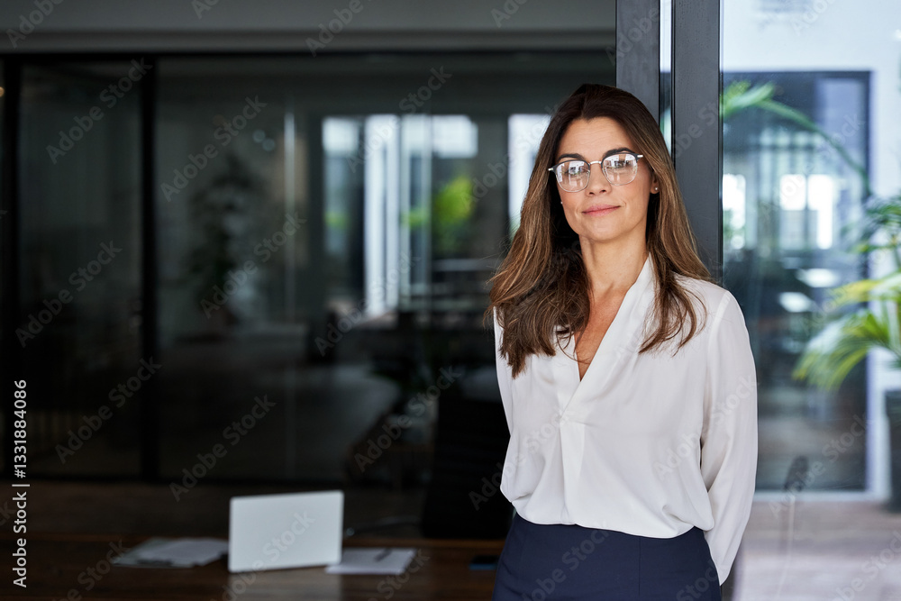 Confident elegant successful 45 years old professional business woman corporate leader, mature female executive manager of middle age wearing eyeglasses standing in office looking at camera, portrait.