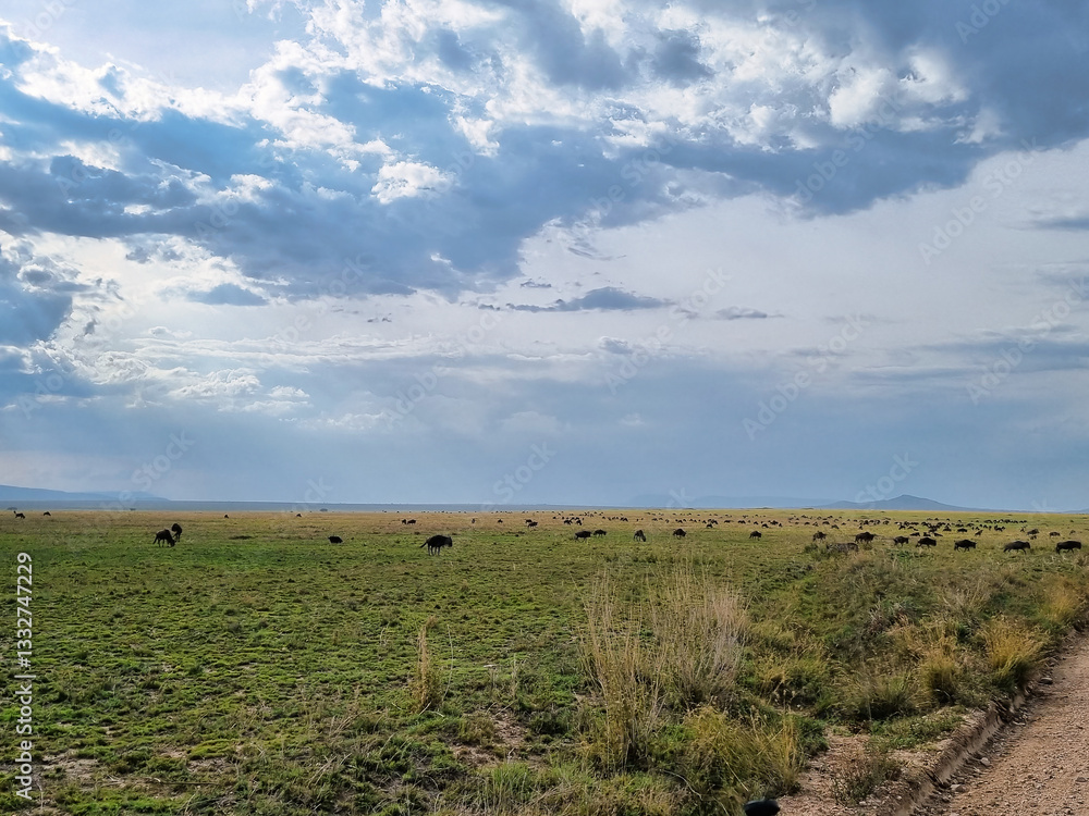 Expansive Pastureland with Livestock Grazing Under Dramatic Skies and Beautiful Clouds Serengeti Tanzania Africa