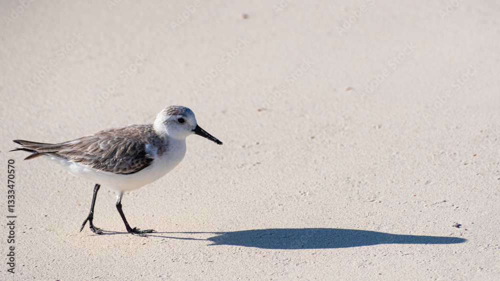 A solitary bird gracefully walks along the sandy beach, casting a soft shadow on the fine sand, embodying tranquility and the beauty of nature in this serene coastal setting.