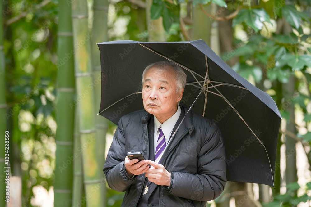 A bamboo forest on a rainy day in Japan, with plenty of greenery in spring. A Japanese man in his late 70s is standing in a suit and a down jacket. He operates his smartphone.