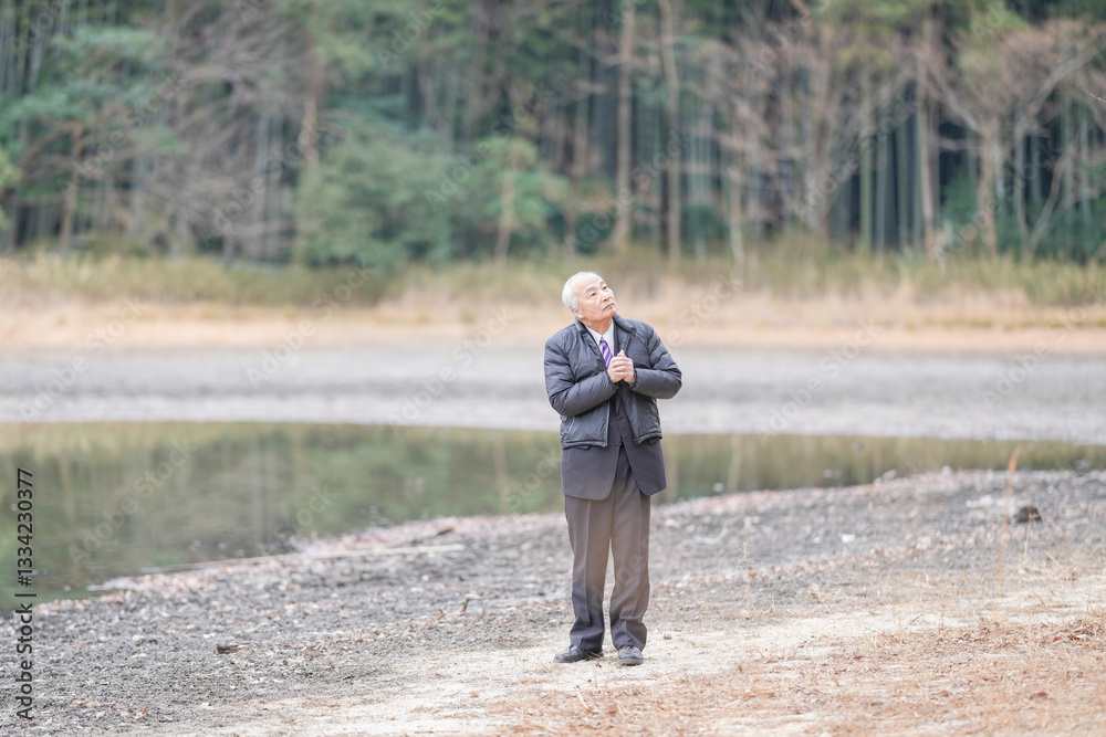 A bamboo forest pond on a spring noon day in Japan with a lot of greenery. A Japanese man in his late 70s is standing in a suit and a down jacket. He looks cold and holds his hands together.