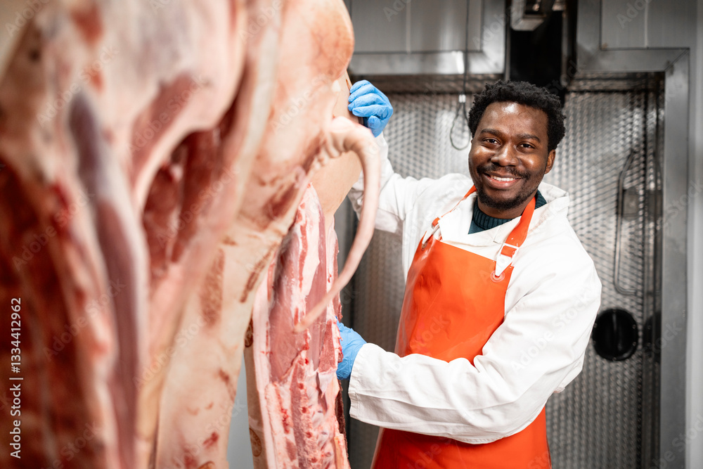 Experienced meat industry worker checking quality of pork meat in slaughterhouse.